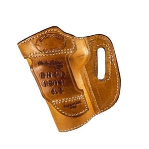 See our Texas Ranger Gun Holster. With a low-cut front for a quicker and more comfortable draw, this item is made of fine American saddle leather and has the following finish options: smooth, basket weave, and hand-embossed.