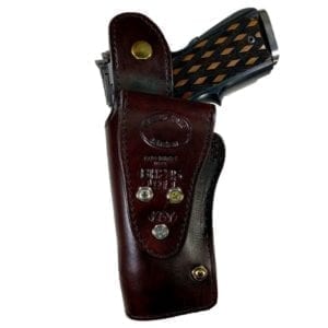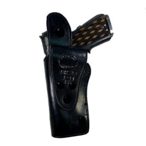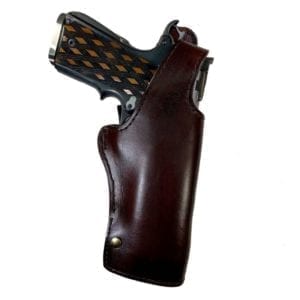 This thumb break high-ride duty holster rides close to the body. It comes with a double retention, 1 thumb break, and 2 retention screws on the slide. Fully smooth leather lined. This holster is designed to fit most semi-auto handguns.