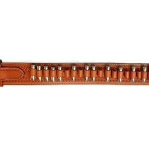 This style holster has quiet dignity with its’ border tooled edging and smooth lines. A separate strap secures the holster. The belt is bordered with a matching design and one inch wide leather cartridge loops. Holster and belt are fully lined.